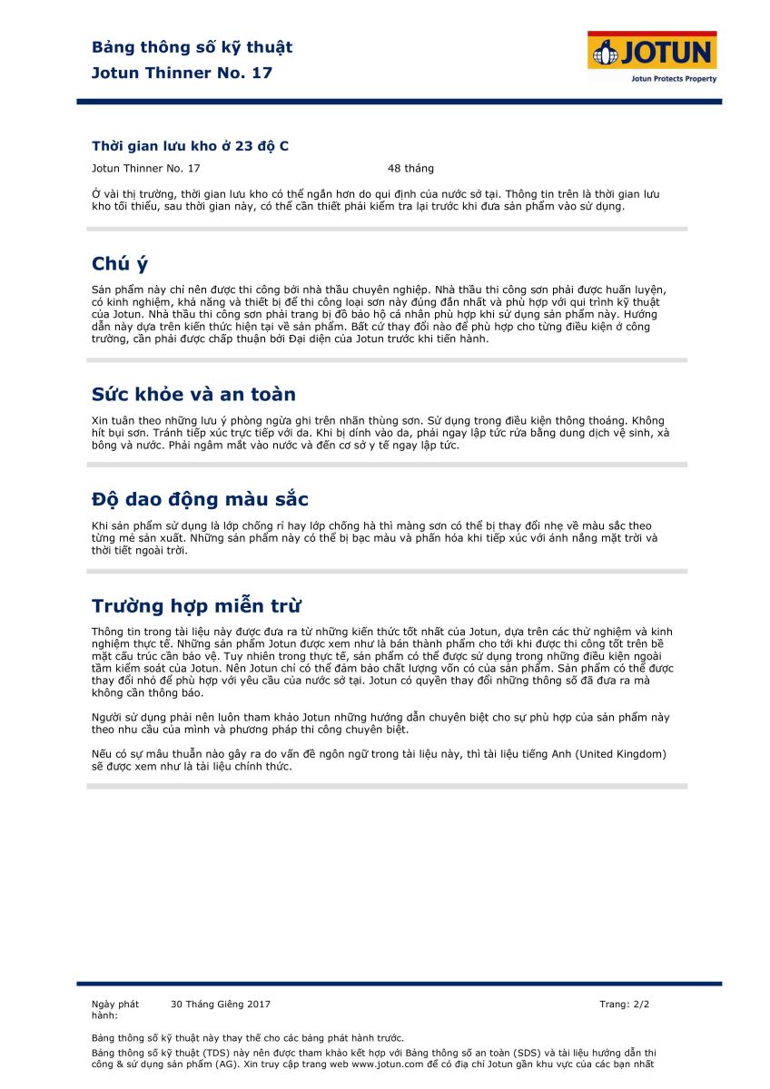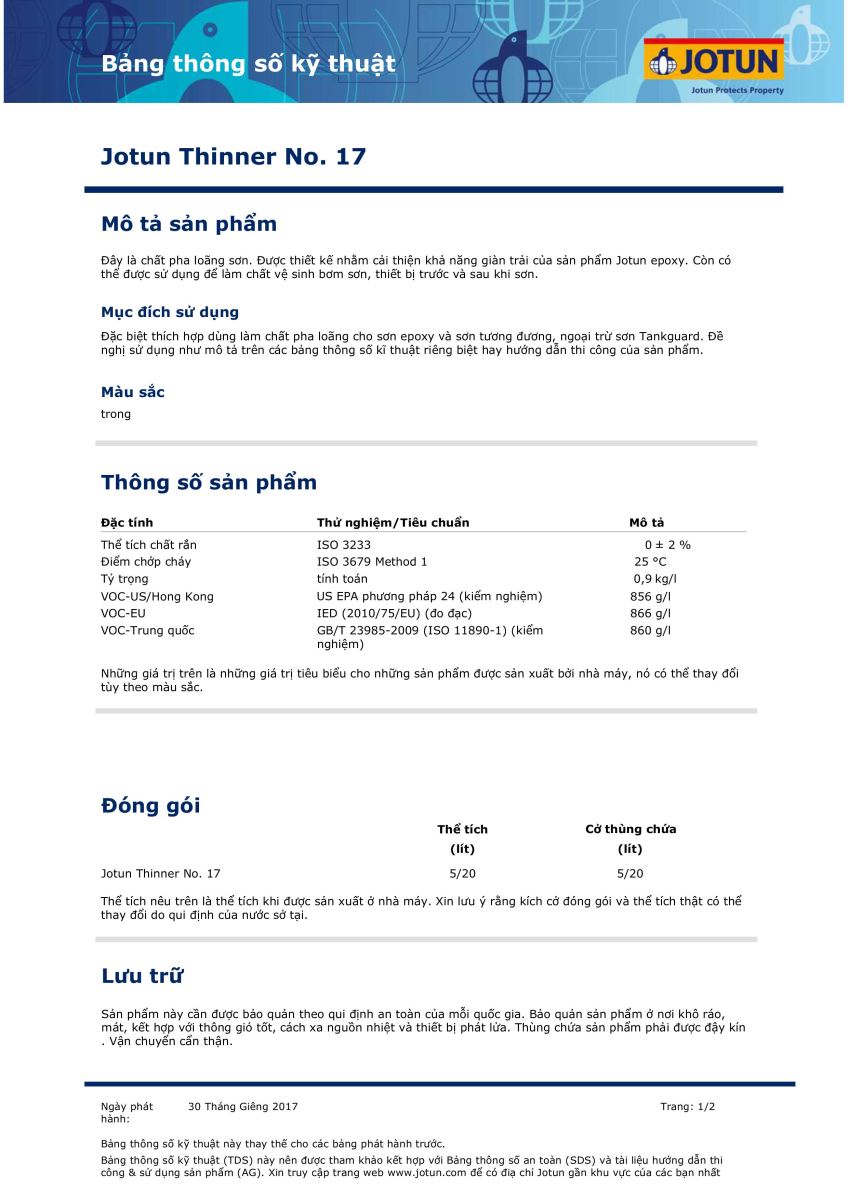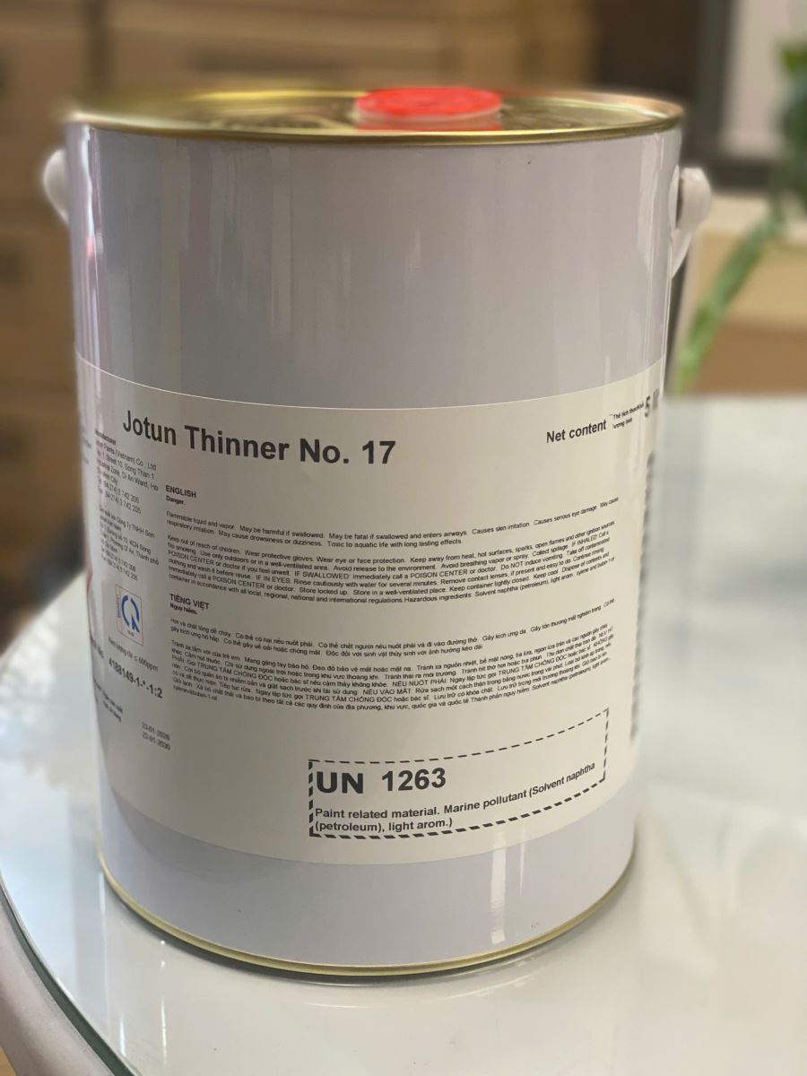Jotun Thinner No. 17 là chất pha loãng sơn chuyên dụng được thiết kế đặc biệt để cải thiện khả năng giàn trải và thi công cho các dòng sơn Epoxy của Jotun. Với chất lượng đạt chuẩn quốc tế, đây là phụ kiện không thể thiếu trong các công trình sơn công nghiệp.